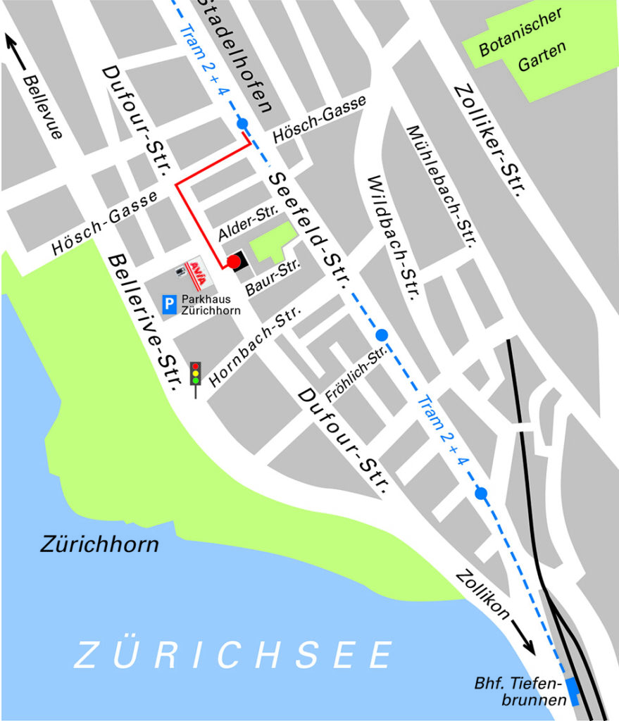 Tram 2 und 4, sowie die Buslinie 33 bis Haltestelle Höschgasse. Bei der Post in die Höschgasse Richtung Zürichsee gehen. Bei der nächsten Kreuzung nach links in die Dufourstrasse einbiegen. Die Praxis befindet sich an der Dufourstrasse 143, direkt gegenüber des Parkhauses und der Avia-Tankstelle.